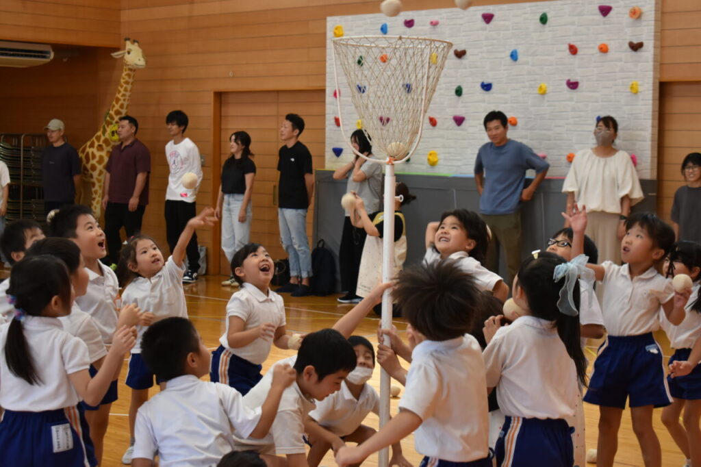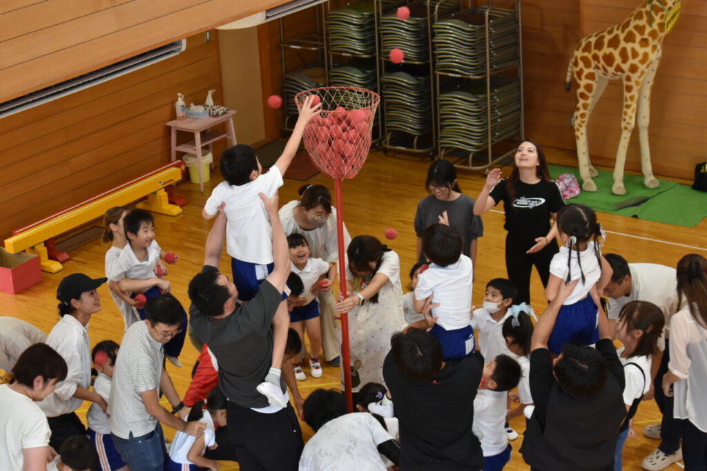 年長ひかり組は 親子で全身あそび・ペアあそび ジャングルぐるぐるとクラス対抗親子玉入れ競争を楽しみました。