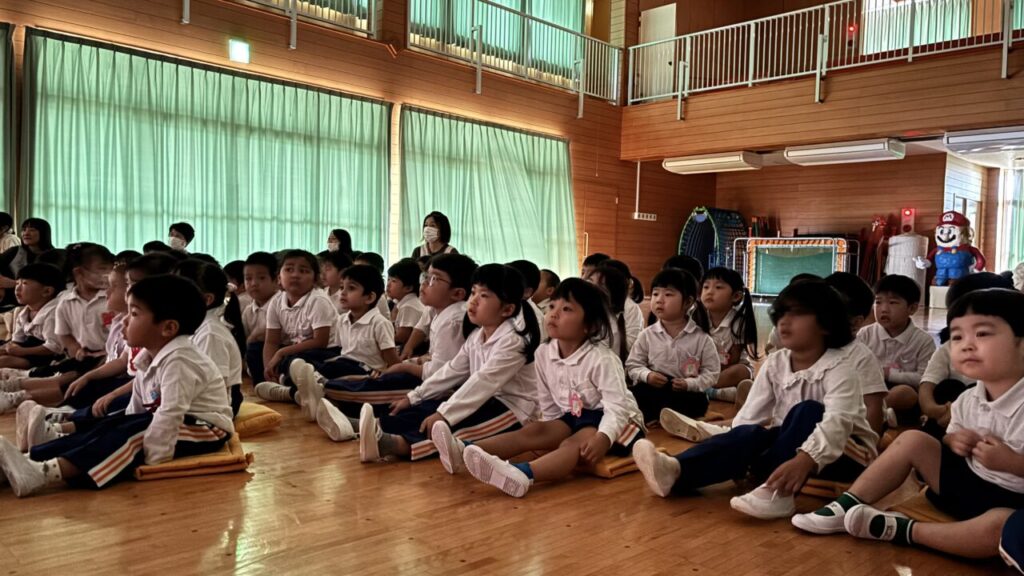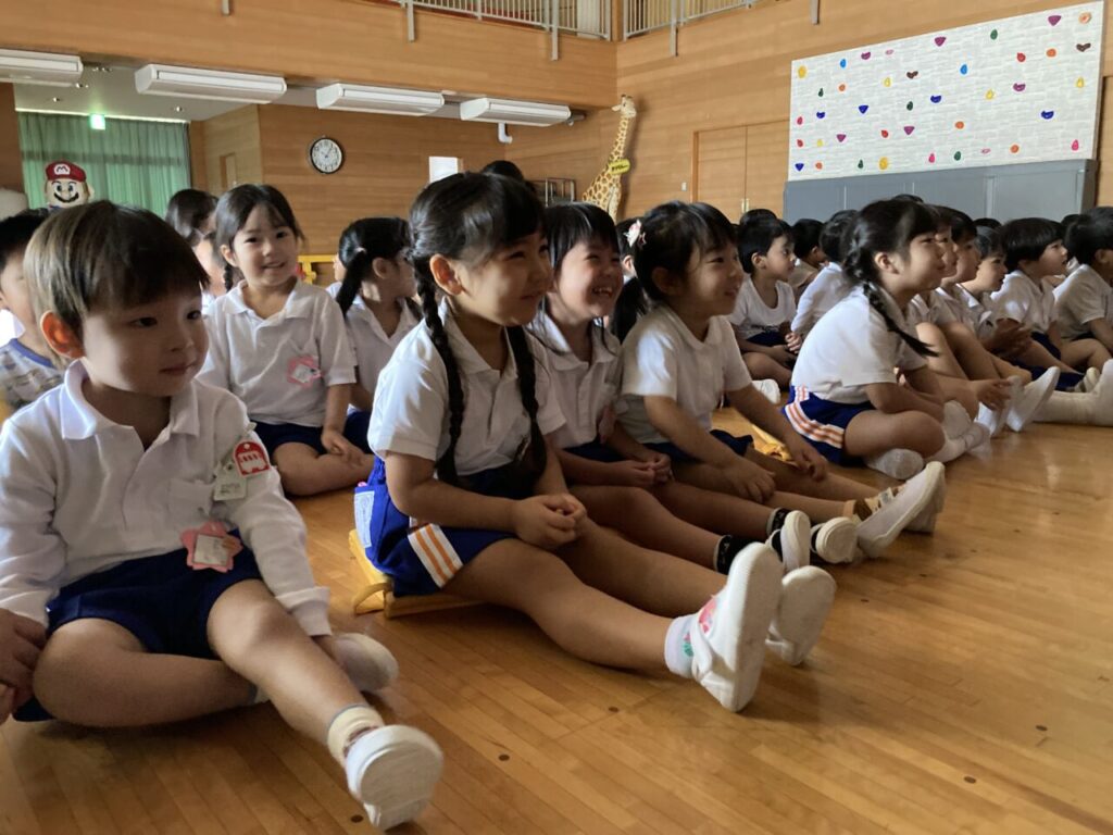 運動会も無事に終わり、今度は12月に生活発表会があります。生活発表会とはどんなことをするのかまだ分からないにじ組とはな組のために、ホールにスクリーンを出してみんなで映画館ごっこをしました。