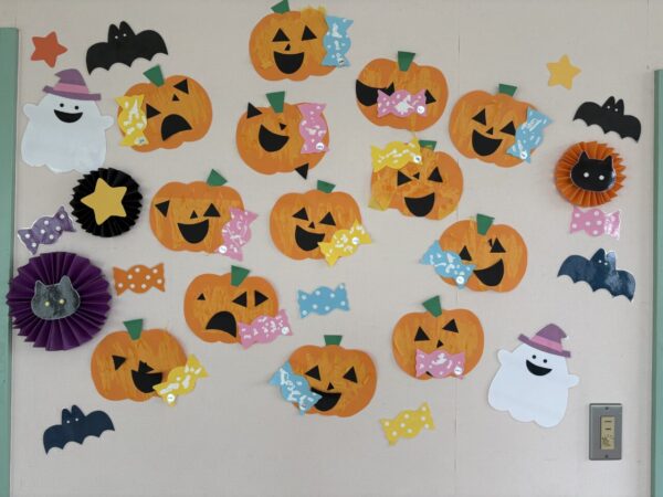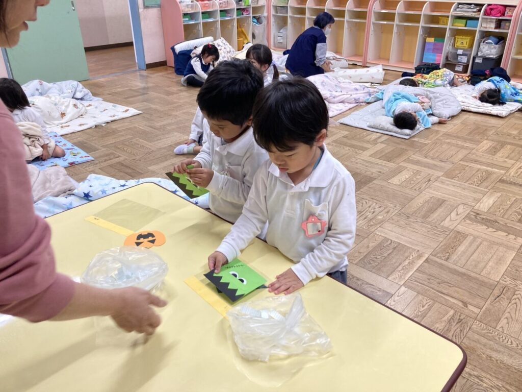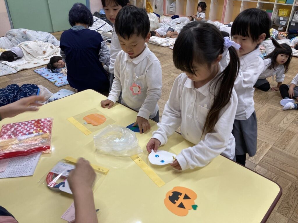 ハロウィン製作 投稿日 2025年10月23日 著者 富士こども園 ブログのカテゴリー にじ組・はな組(3歳児・満3歳児) 預かり保育では、10月28日の群馬県民の日に行うハロウィンに向けて製作をしました。 子ども達が二種類キャラクターを選び、透明な袋に貼りました。 「私はこれにしたんだ」「僕はこれだよ」と話しながら、楽しんで参加していました。