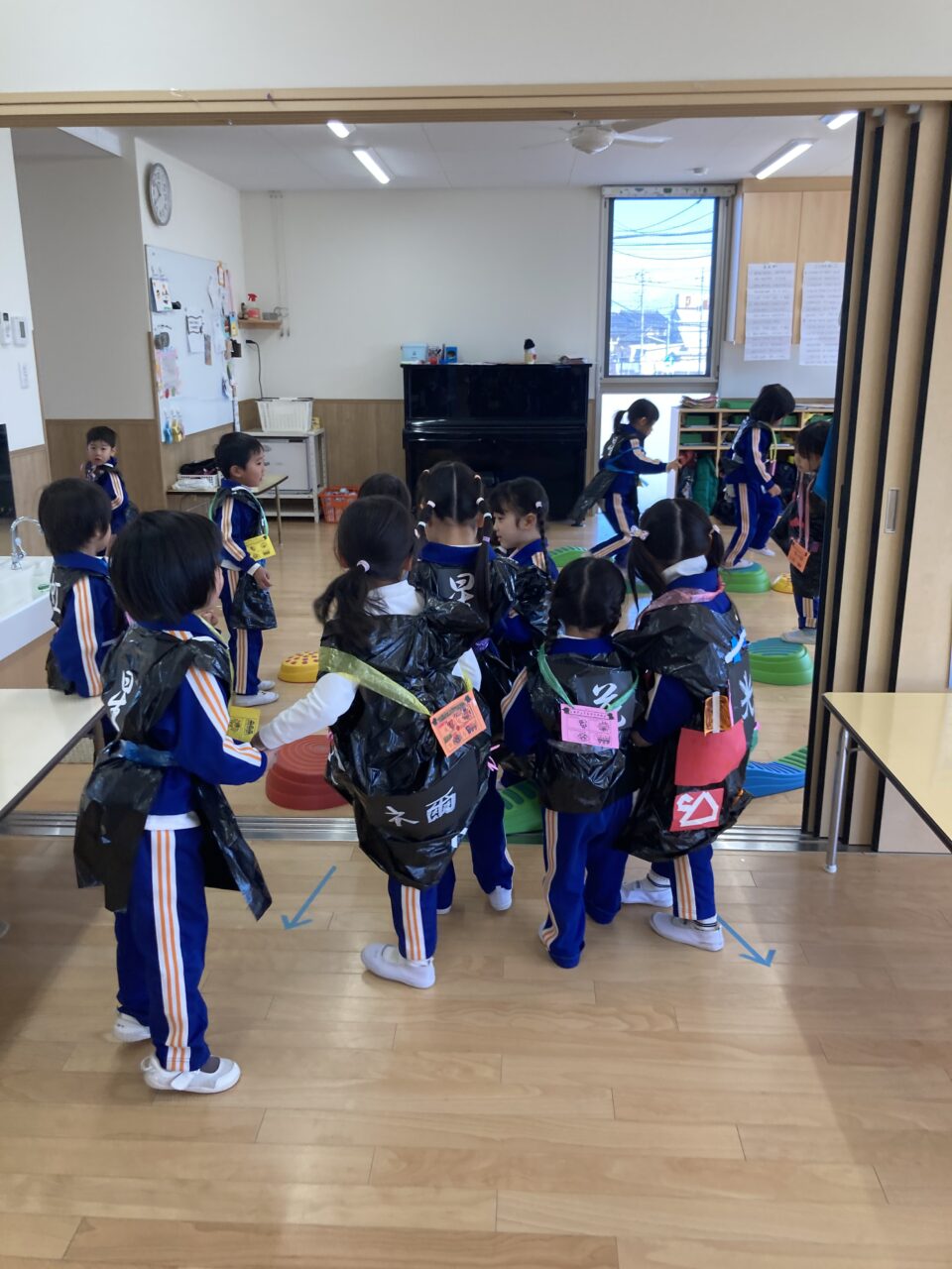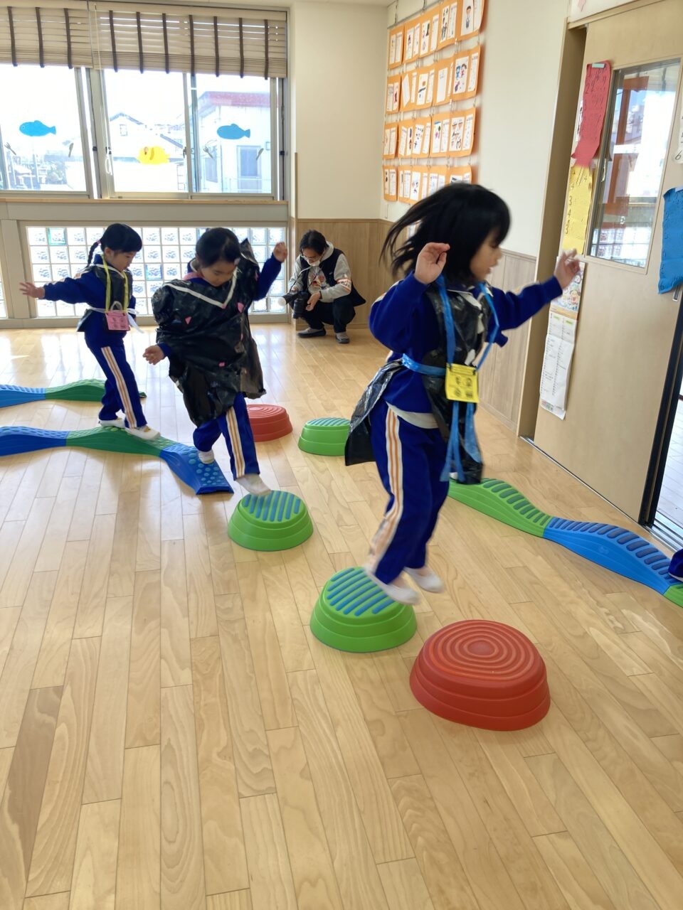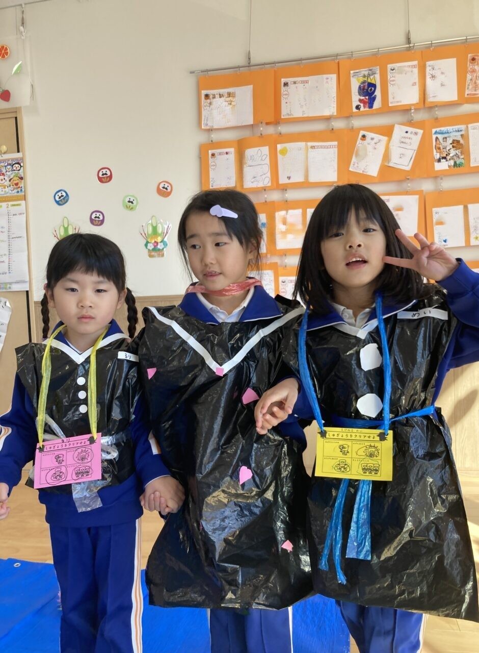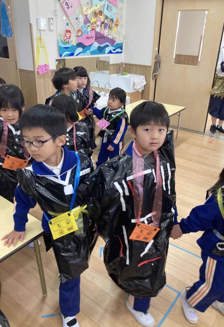 にこにこ交流会 投稿日 2026年1月22日 著者 富士こども園 ブログのカテゴリー ひかり組(5歳児) ブログのカテゴリー ほし組(4歳児) ブログのカテゴリー にじ組・はな組(3歳児・満3歳児) 『みんなで修業をして鬼をやっつけよう!!』というテーマに合わせて、ひかり組・ほし組・にじ組・はな組で3人組になり修行の旅に出ました。 子ども達がわくわくするようなルール説明を観て、ますます修行へ行きたくなった子ども達は元気よくいざ修行へ・・・ 楽しくたくさん修行した子ども達は、力を合わせて鬼を倒して無事修行の旅を終わり笑顔と元気いっぱいの子ども達でした。