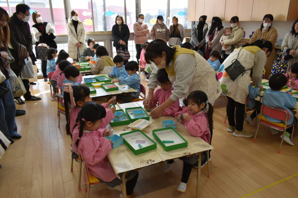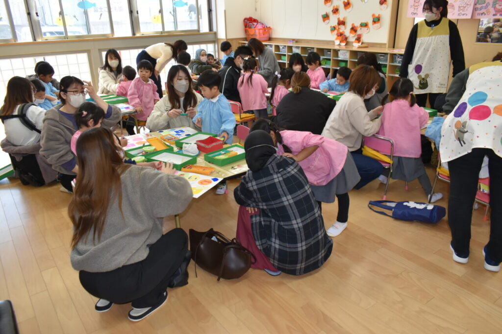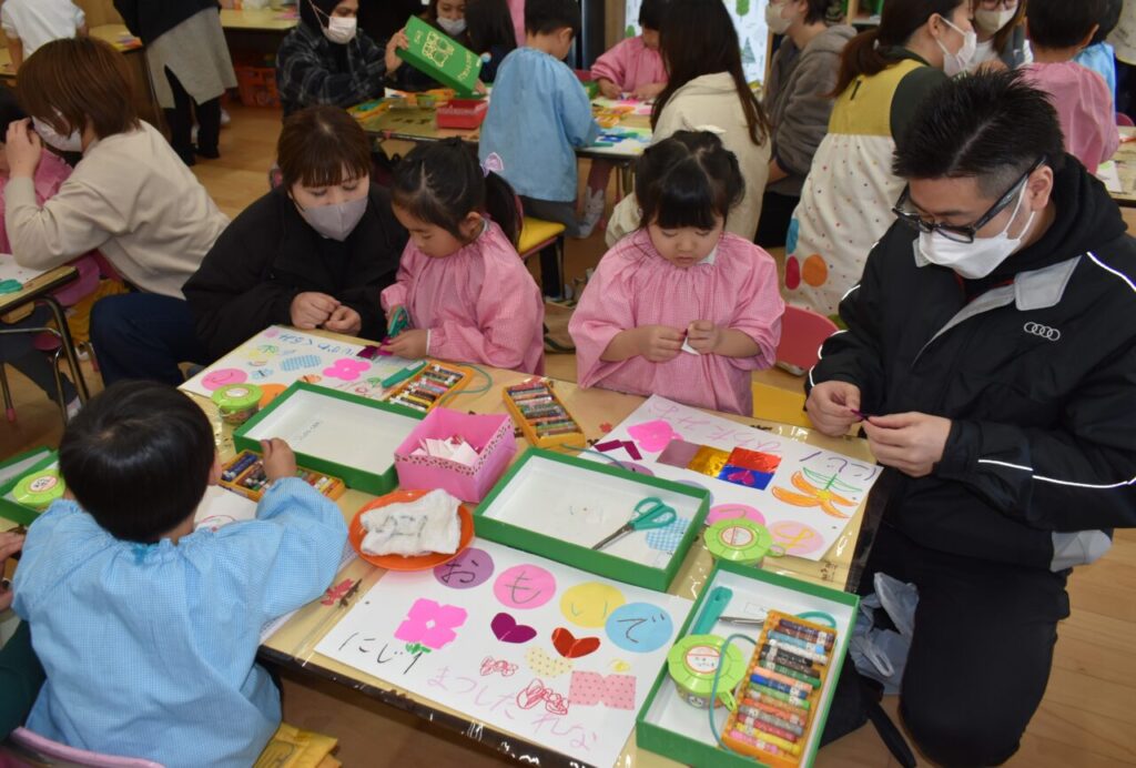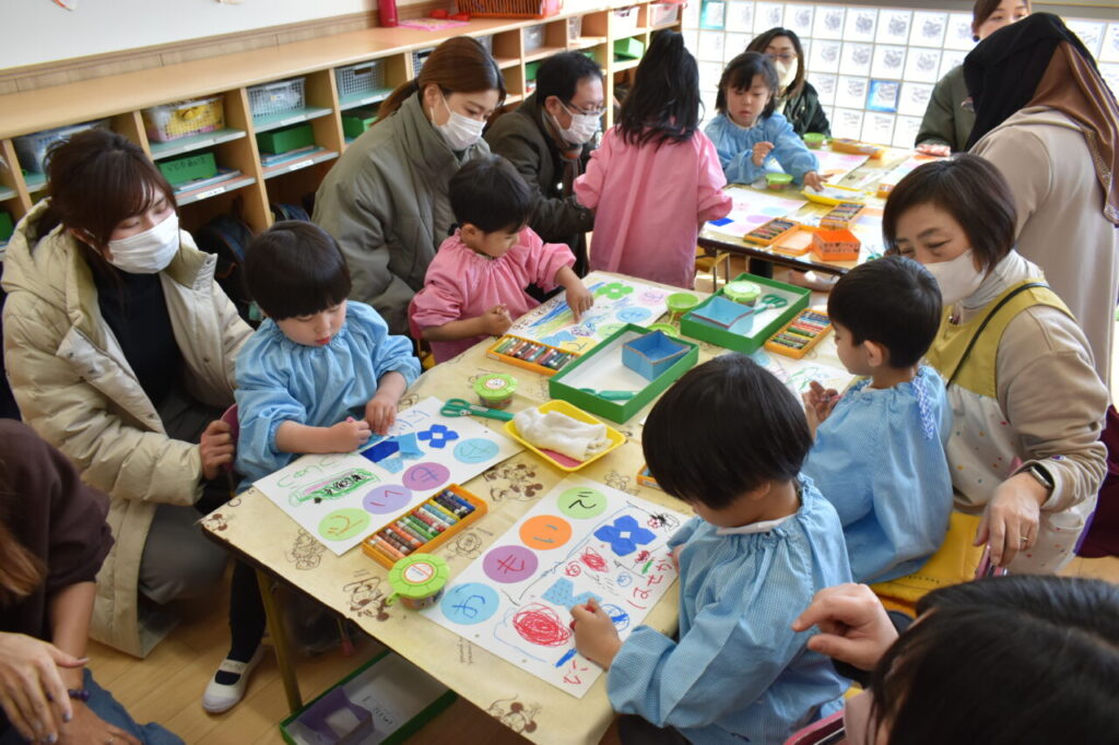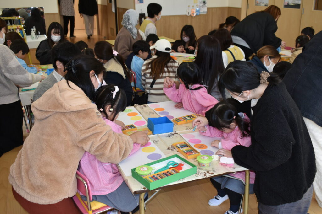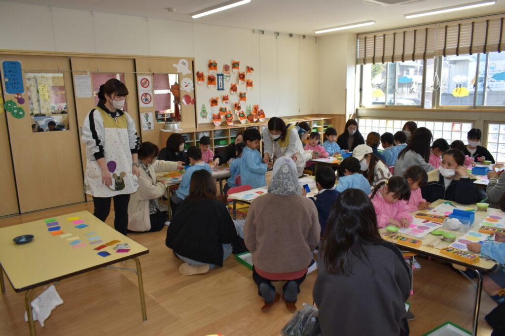 保育参観(年少 にじ組・はな組) 投稿日 2026年2月19日 著者 富士こども園 ブログのカテゴリー にじ組・はな組(3歳児・満3歳児) 2月13日に、にじ組・はな組の保育参観がありました。「おもいで」(4月から作ってきた製作物をまとめたもの)の表紙を親子で作りました!
