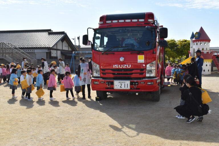 11月14日(金)に 館林消防署の消防士さん立ち会いの下、避難訓練を行いました。避難訓練の後は、消防士さんから避難の時の大切なお話を聞き、お話のあとは消防自動車の見学をしました。 -